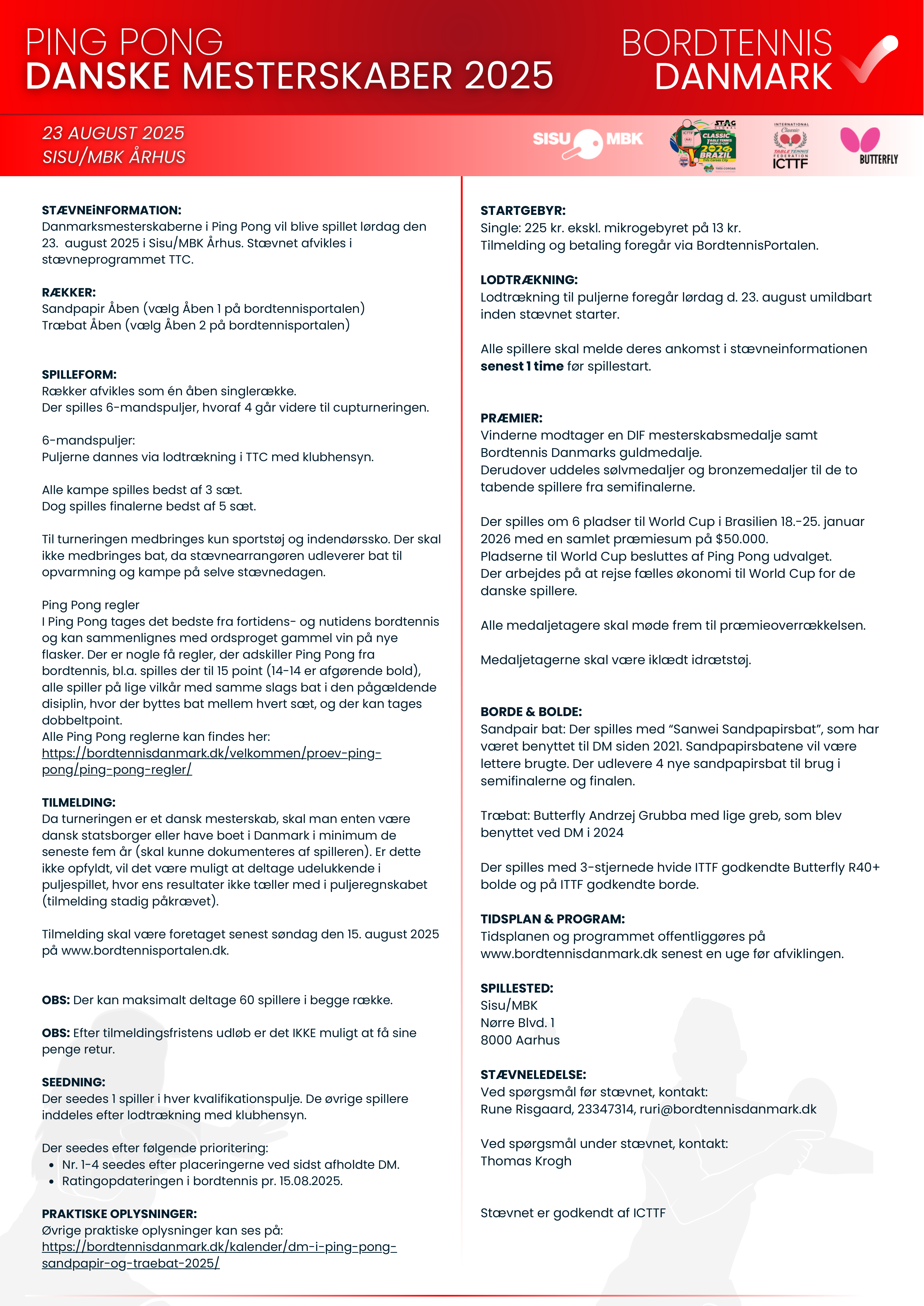 Indbydelse, tidsplan, praktisk info samt tilmelding/betaling til Ping Pong DM 2025. -